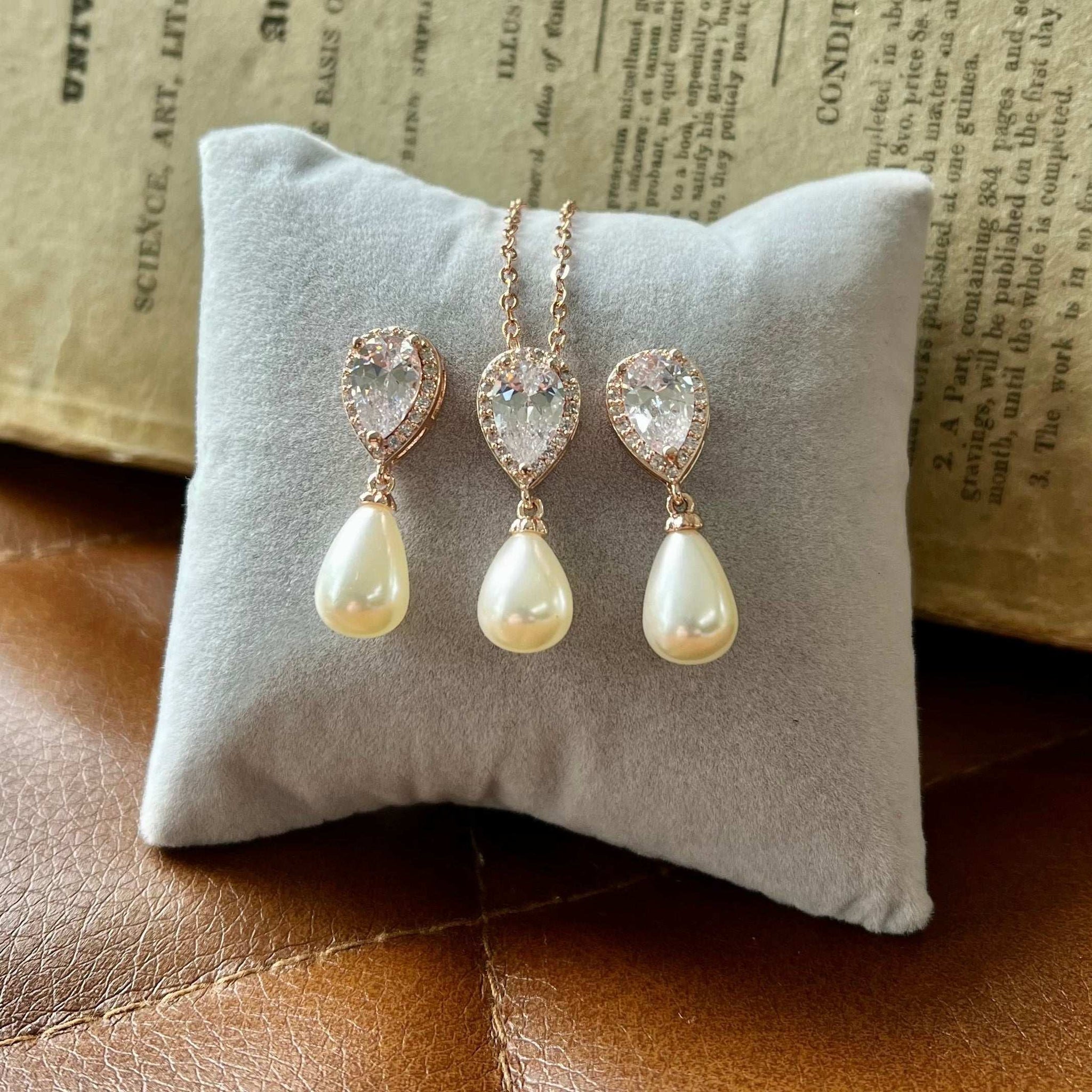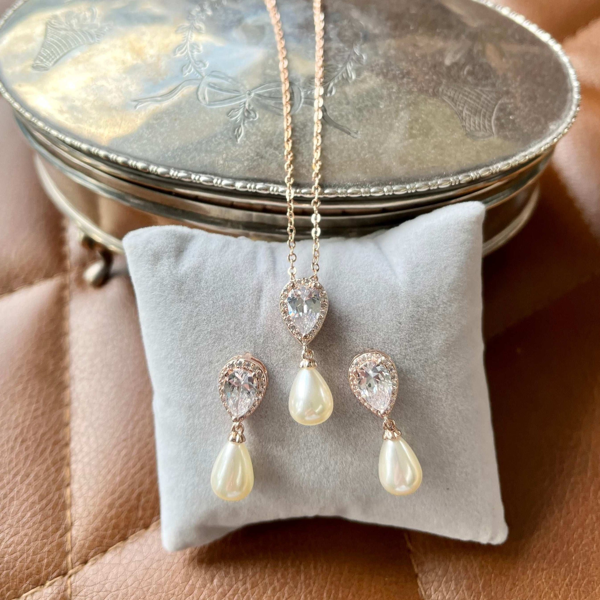 Rose Gold Crystal Teardrop Pearl Earrings with Pendant Necklace